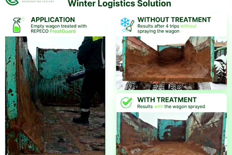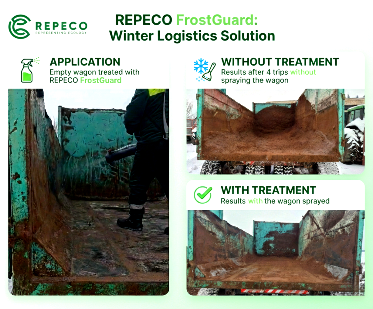 Siekdama išspręsti šią problemą, REPECO sukūrė FrostGuard – tvarų pramoninį cheminį sprendimą, skirtą užkirsti kelią medžiagos prilipimui durpių transportavimo metu šaltomis sąlygomis. FrostGuard sudaro apsauginį sluoksnį ant vagono paviršių, užtikrindamas sklandų ir pilną iškrovimą net esant –20 °C ir žemesnei temperatūrai.